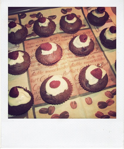 Natürlich könnt Ihr auch Himbeeren aus dem Tiefkühlfach nehmen, schöner sehen allerdings frische Himbeeren auf dem Schokohäubchen aus.