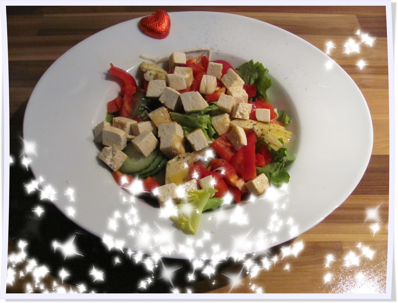 Nachdem ich den Tofu kurz angebraten habe, wird alles auf einem großen Teller angerichtet. Ein bisschen Salz, Pfeffer und Schnittlauch über den Salat geben und fertig ist mein heutiges „The best of the rest“-Gericht.