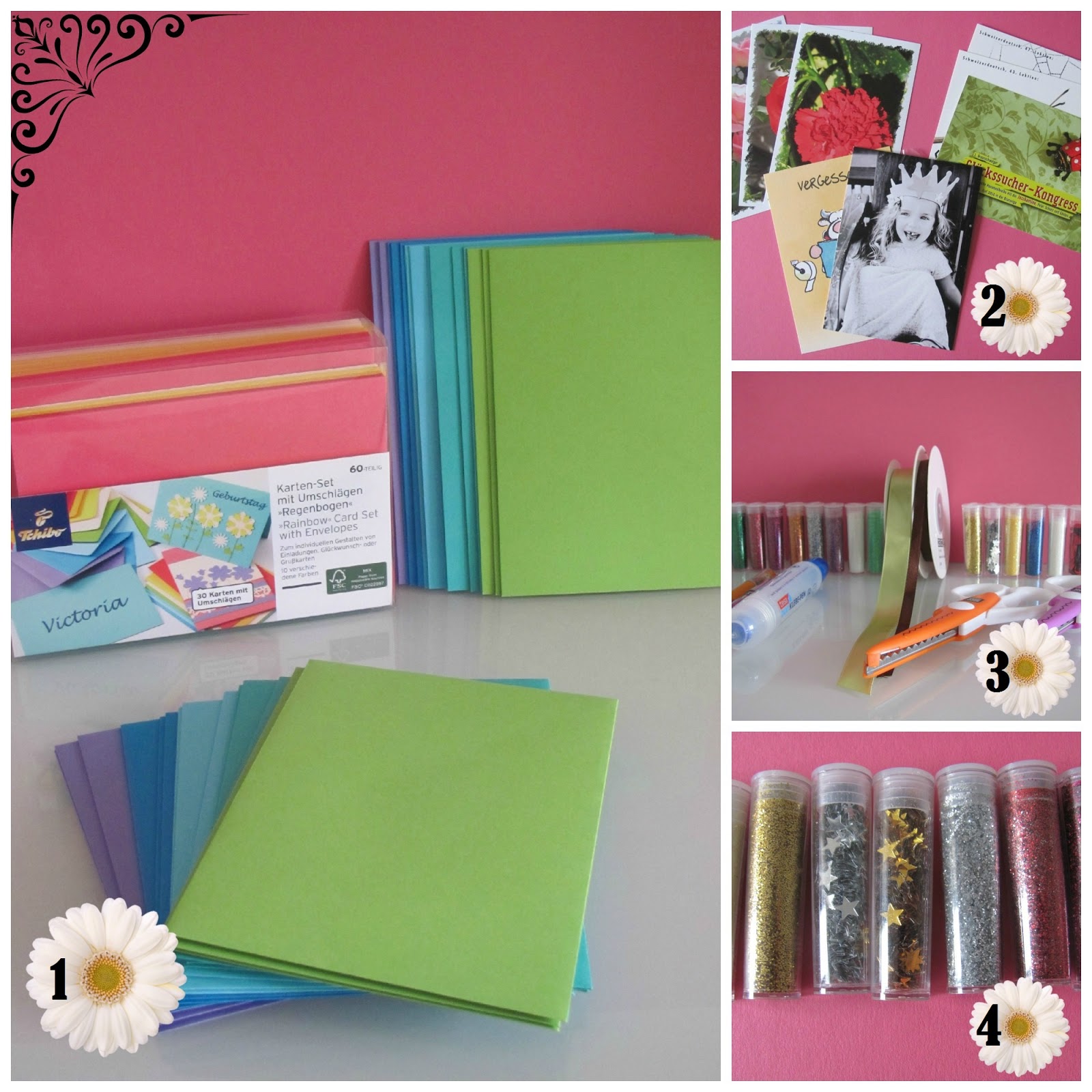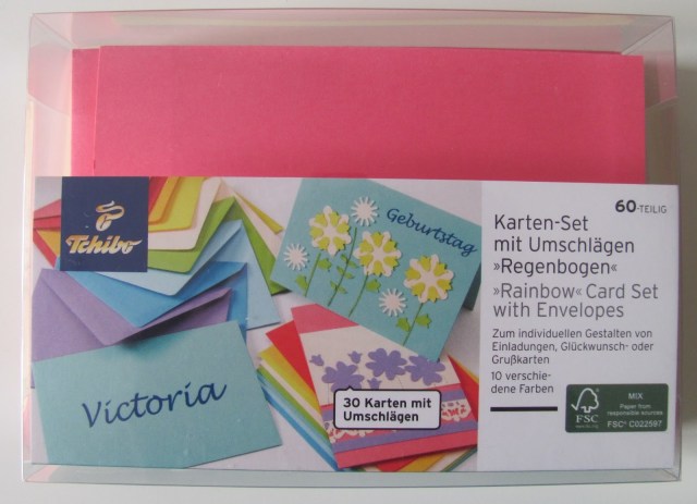 Farbige Briefumschläge und Fotokarton könnt Ihr einzeln in jedem gut sortierten Bastelgeschäft und Schreibwarenhandel kaufen. Dort werden oftmals auch Sets angeboten, wo z.B. 50 sortierte Briefumschläge und dazugehörige Karten enthalten sind.