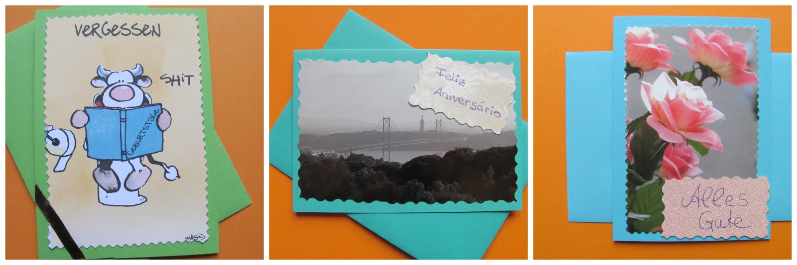 2. Ich habe immer einen kleinen Vorrat an Fotos und Postkarten. Postkarten findet man inzwischen sehr häufig in Cafes oder Lokalen mit witzigen Sprüchen und Motiven als Give-Away, sprich gratis.