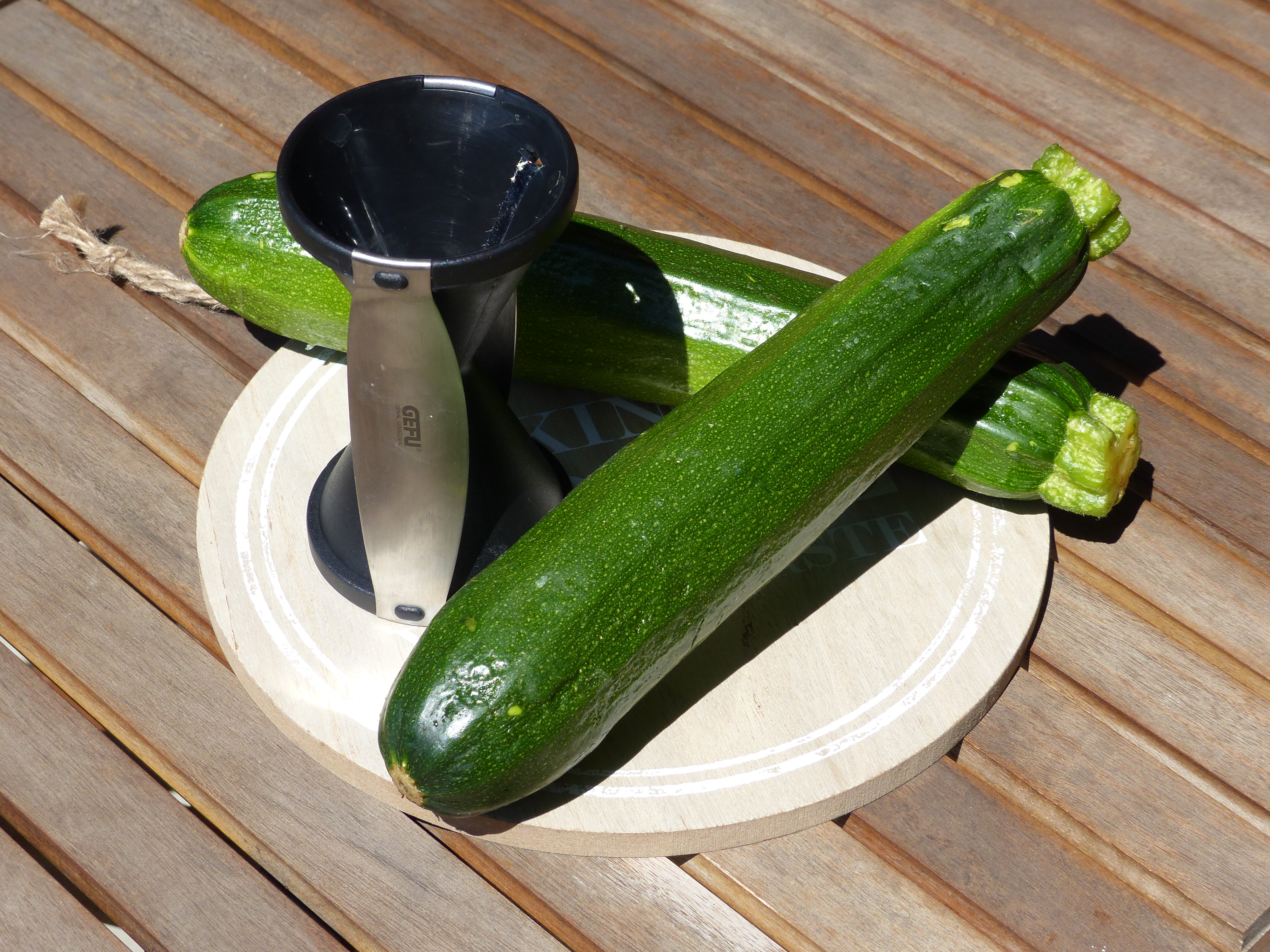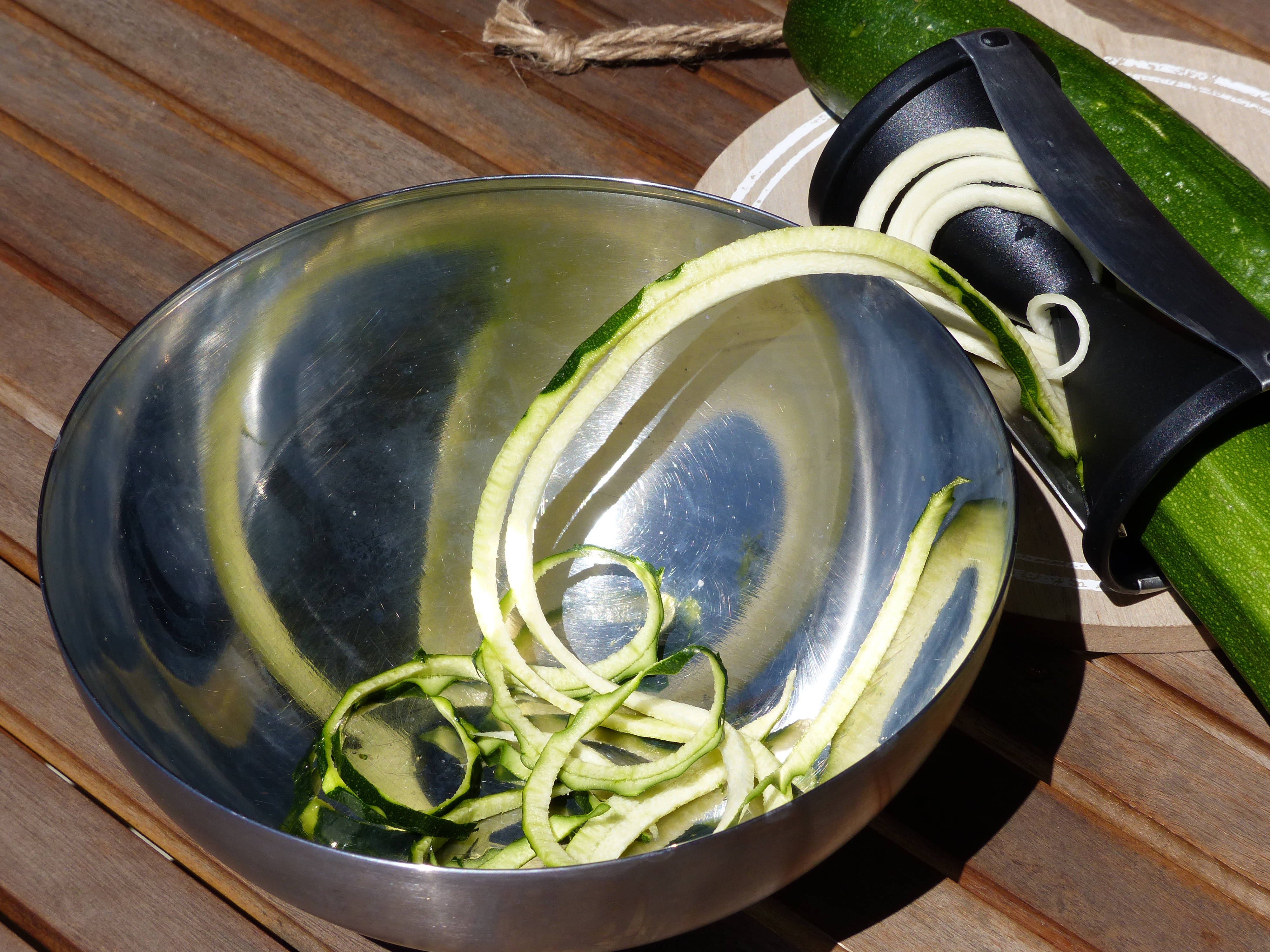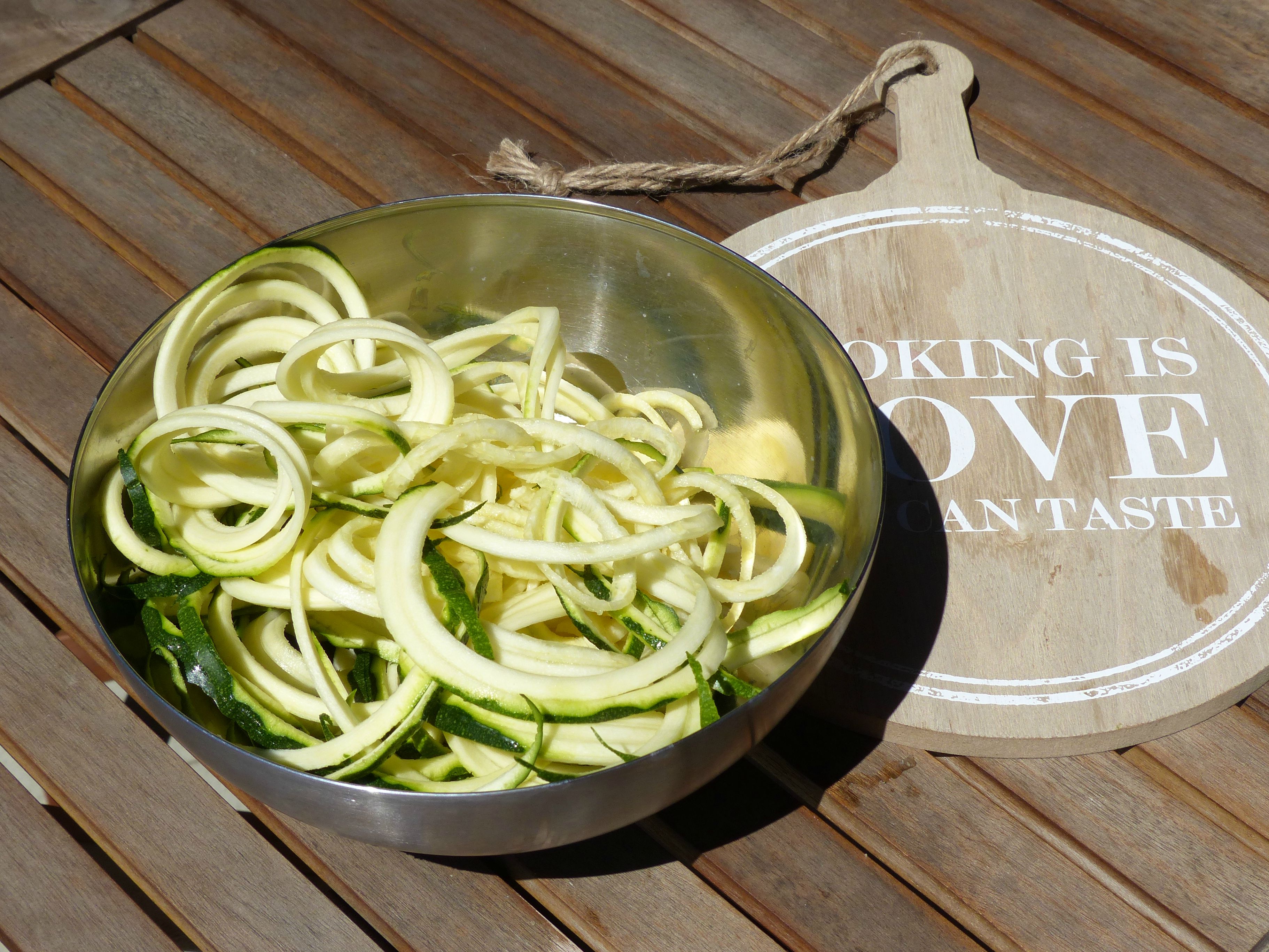 Um Zoodles herzustellen, benötigt man neben den Zucchini einen Spiralschneider. Es mag auch einige Leute geben die zum Herstellen von Zoodles einen Julienne-Schneider benutzen, aber gerade wenn man auf den Geschmack gekommen ist und öfters Zoodles in seinen Speiseplan integrieren möchten lohnt sich die Investition in einen Spiralschneider. Ich kann Euch den GEFU Spiralschneider Spirelli empfehlen, mit dem ich bisher gute Erfahrungen gemacht habe. Ihr erhaltet ihn in gut sortierten Haushaltswaren-Fachgeschäften, in den Haushaltswarenabteilungen von Kaufhof und Karstadt oder direkt bei GEFU *klick* (Versandkostenfrei). Wenn Ihr Euch für einen Spiralschneider entscheidet , solltet Ihr bei der Auswahl der Zucchini darauf achten, dass diese nicht zu dick sind, da sie sonst nicht durch den Schneider gedreht werden können. Lieber 2 dünne Zucchini, statt 1 dicken nehmen.