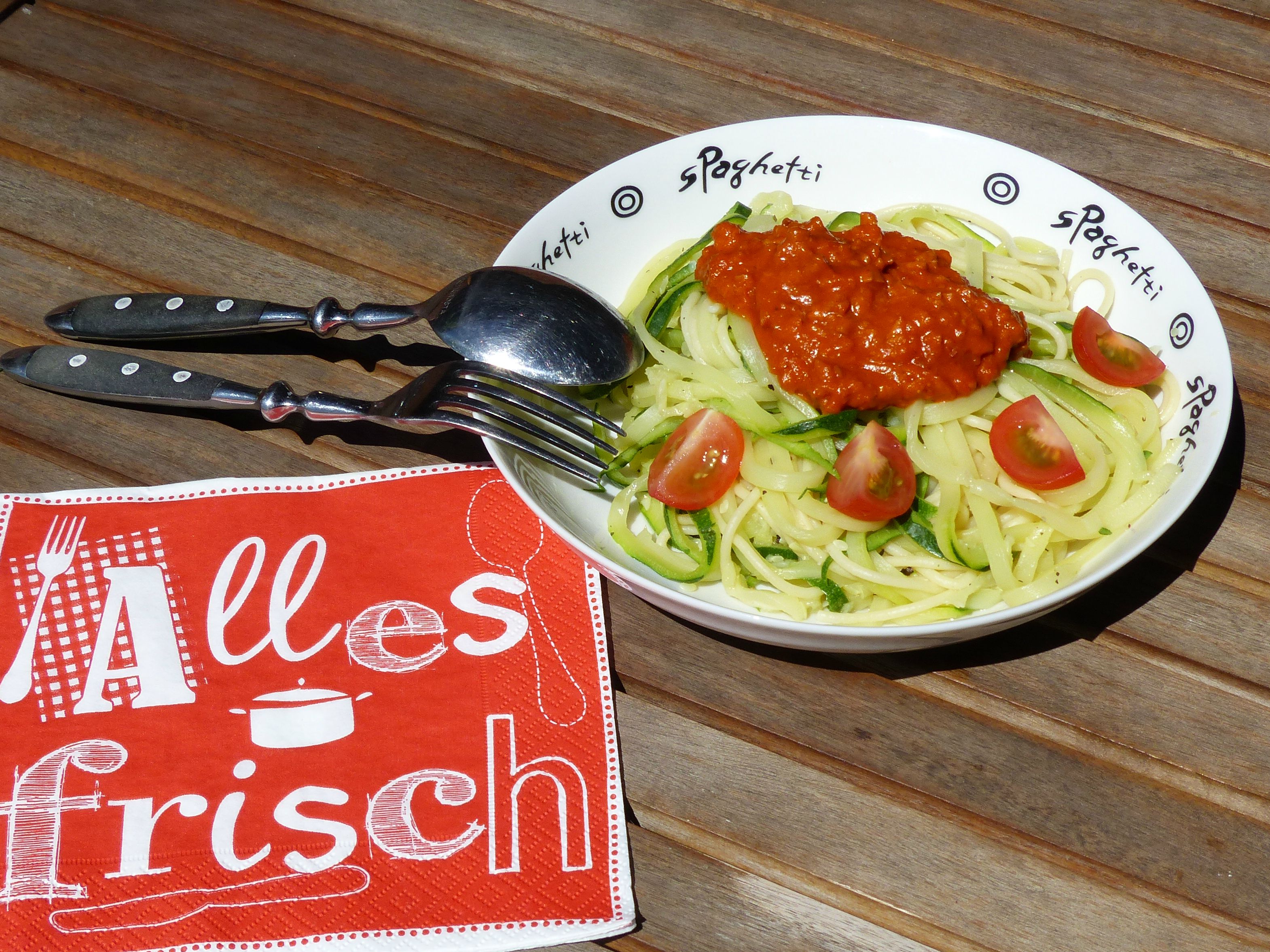 Da ich auf die geliebten Spagetti nicht verzichten möchte, habe ich bei der Zubereitung jeweils zur Hälfte Spaghetti und Zoodles verwendet: