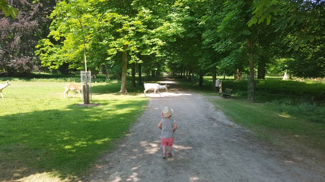 Natürlich in den Wald, oder genauer gesagt in den begrünten Tierpark Hannovers, den die wenigsten Hannoveraner kennen. Auf einem weitläufigen Gelände, unter schattigen Bäumen kann man hier mit etwas Glück dem Rotwild begegnen, Enten beobachten oder auch die Wildschweine in Ihrem Gehege besuchen. Bei über 30 Grad war es ein angenehmer Ausflug, entlang unter riesigen, alten Bäumen und durch rechts und links vom hohen Gras umgebenen Waldwegen. Hier durfte die Oma auch Bellas ersten großen Trotzanfall beiwohnen. Bei 30 Grad im Schatten konnte ich meine Tochter beim besten Willen nicht mehr tragen. Zu Fuß gehen oder im Buggy sitzen waren in Bellas Augen leider keine Alternative. Mir jedoch blieb nichts anderes übrig als unsere Zaubermaus in den Buggy zu setzen , damit wir unseren Weg fortsetzen konnten, was allerdings ein lautes Geschrei nach sich zog – für die nächste halbe Stunde. Erst mit der Aussicht auf den Spielplatzbesuch ließ sich die kleine Motzkuh dann halbwegs versöhnen.