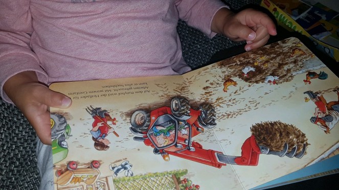 Mit diesem Buch über Bagger, Laster, Traktor und Co. lagen wir bei Bella goldrichtig. Ich hatte es eigentlich aus einer Schnäppchen-Laune heraus gekauft und es dann vor einigen Tagen einfach mal aus unserem Bücherfundus geholt. Die Altersempfehlung des Verlages sagt ab 18 Monaten – obwohl das mit den Altersangaben ja immer so eine Sache ist. Hier erwies sie sich allerdings als passend.