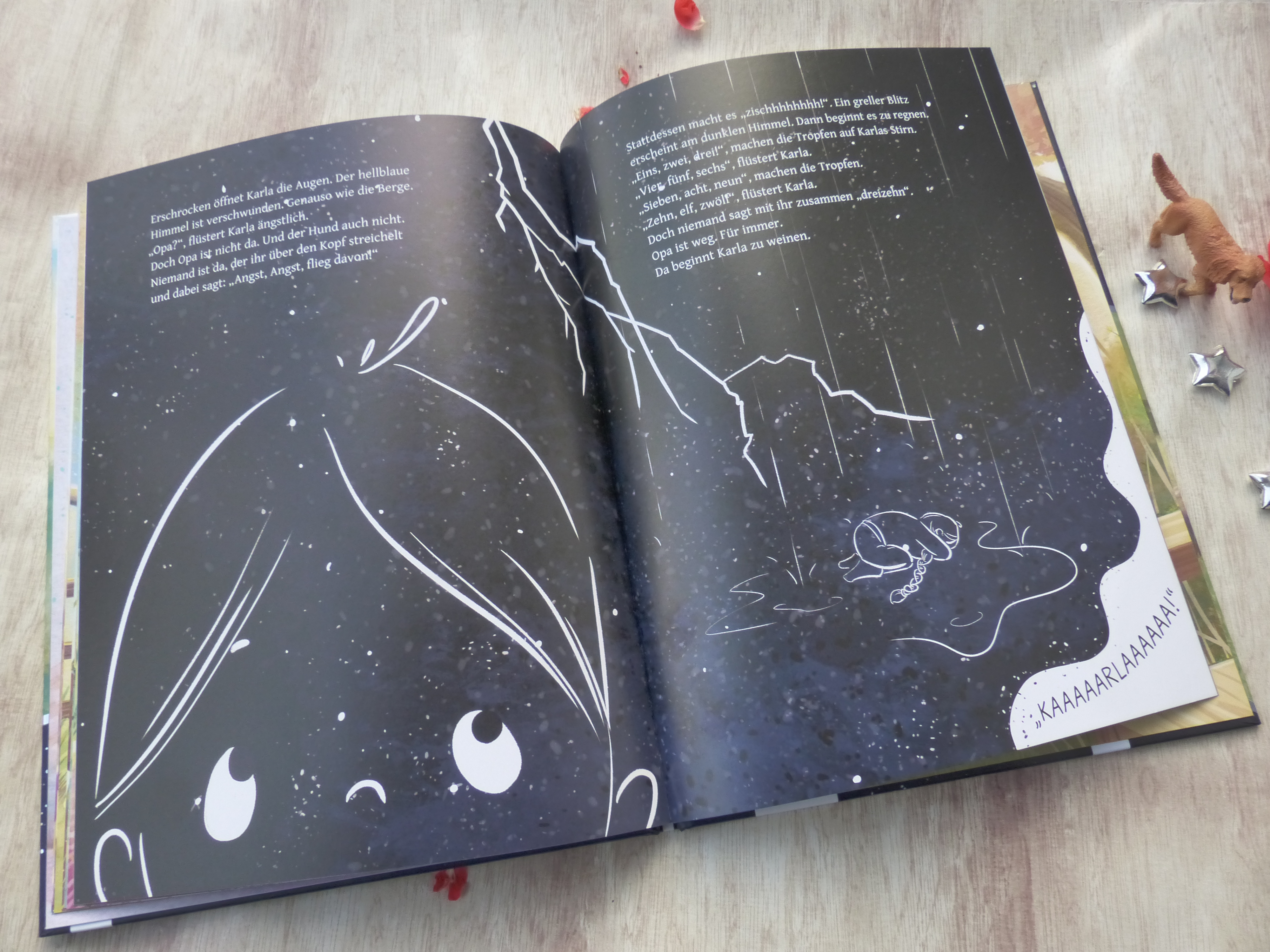 Trotz des traurigen Themas sprudeln das Buch und vor allem die Illustrationen vor Lebensernergie. Die Erinnerungen von Klara sind bunt und farbenfroh, genauso wie die Zeit mit Ihrem Opa. Indirekt werden hier die verschiedenen Trauerprozesse dargestellt, aber auf eine sehr einfühlsame Art und Weise. Mir gefällt es, dass nicht verschwiegen wird, dass mit der Trauer und dem Verlust eines geliebten Menschen auch dunkle Augenblicke einhergehen. Als Karla begreift, dass Opa für immer weg ist, fängt sie an zu weinen. Die Illustration der entsprechenden Doppelseite ist dunkel und einfach gehalten, doch schon auf der nächsten Seite wird Karla aus diesen Tief herausgerissen. Ihre Eltern sind für sie da und zeigen Ihr, dass das Leben auch nach Opas tot weiter geht.