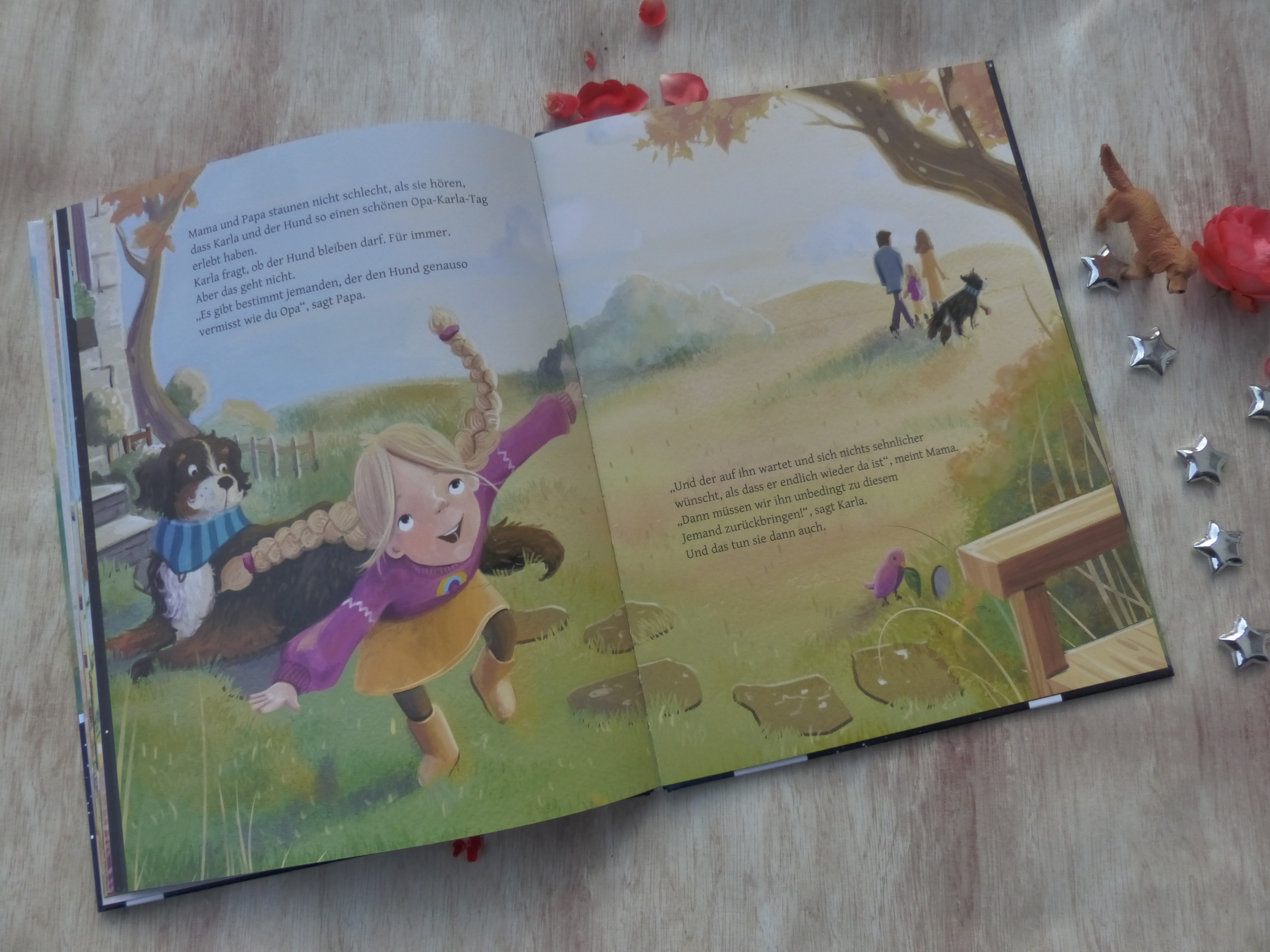 Karla hat Ihren Opa verloren. Sie hat viel Zeit mit ihm verbracht, und das er nun für immer fort sein soll, dass versteht sie nicht so wirklich. Eines Tages sitzt auf Opas Gartenbank ein großer Hund, der Karla an Ihren geliebten Opa erinnert. Sie erlebt mit Ihm einen ganzen Tag, und stolpert dabei immer wieder über liebevolle Erinnerungen an die gemeinsame Zeit mit Ihrem Opa. In Ihrer Trauer flüchtet sich Karla in all die schönen Erinnerungen , bis sie schließlich zu begreifen begreifen , dass ihr Opa wirklich und für immer Weg ist. Am Ende trifft sie die Erkenntnis, dass Erinnerungen an einen verstorbenen Menschen dafür sorgen, dass er doch noch irgendwie da ist und nicht vergessen.