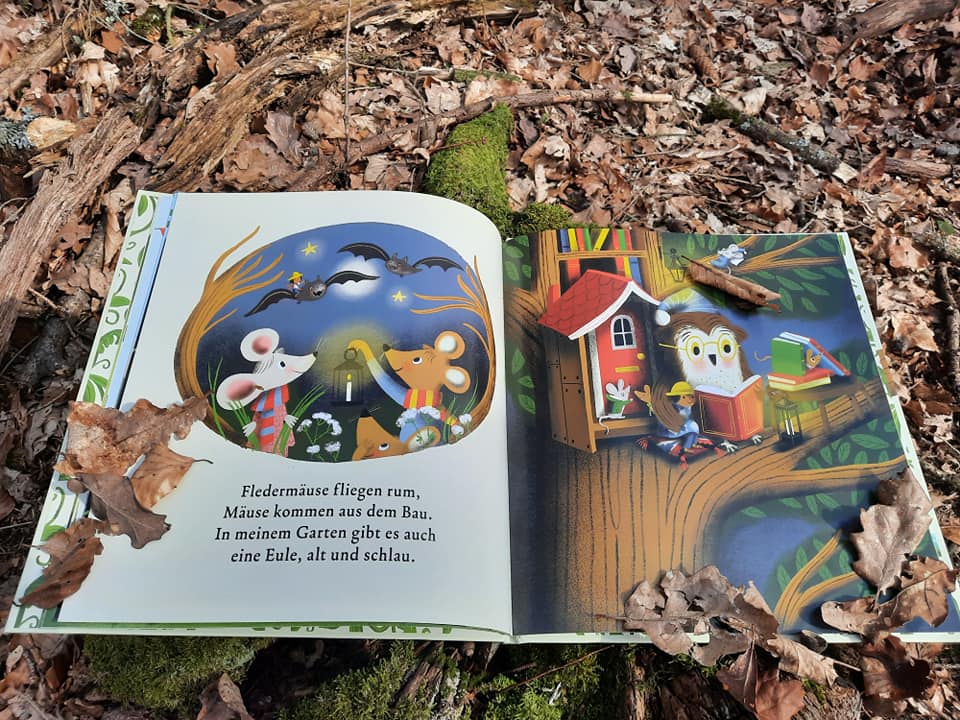 „Der Natur auf der Spur“ ist ein 30 seitiges Bilderbuch für kleine Naturfreunde und nimmt die jungen Leser mit auf kleine und große Abenteuer im eigenen Garten. Auf den großformatigen Doppelseiten stehen vor allem die Illustrationen, und weniger der Text im Vordergrund. Auch die Geschichten ,die dieses Buch mit seinen Bildern erzählt sind vielfältig wie die Natur. Da gibt es zum einen den Vogelgeburtstag, Eichhörnchen stibitzen die Nussvorräte und eine alte weise Eule liest zur Abendstunde aus Ihren Büchern vor. Immer wieder gibt es Neues zu entdecken und die Kinder werden angeregt mit Ihren eigenen Worten die Geschichten zu den Illustrationen zu erzählen.