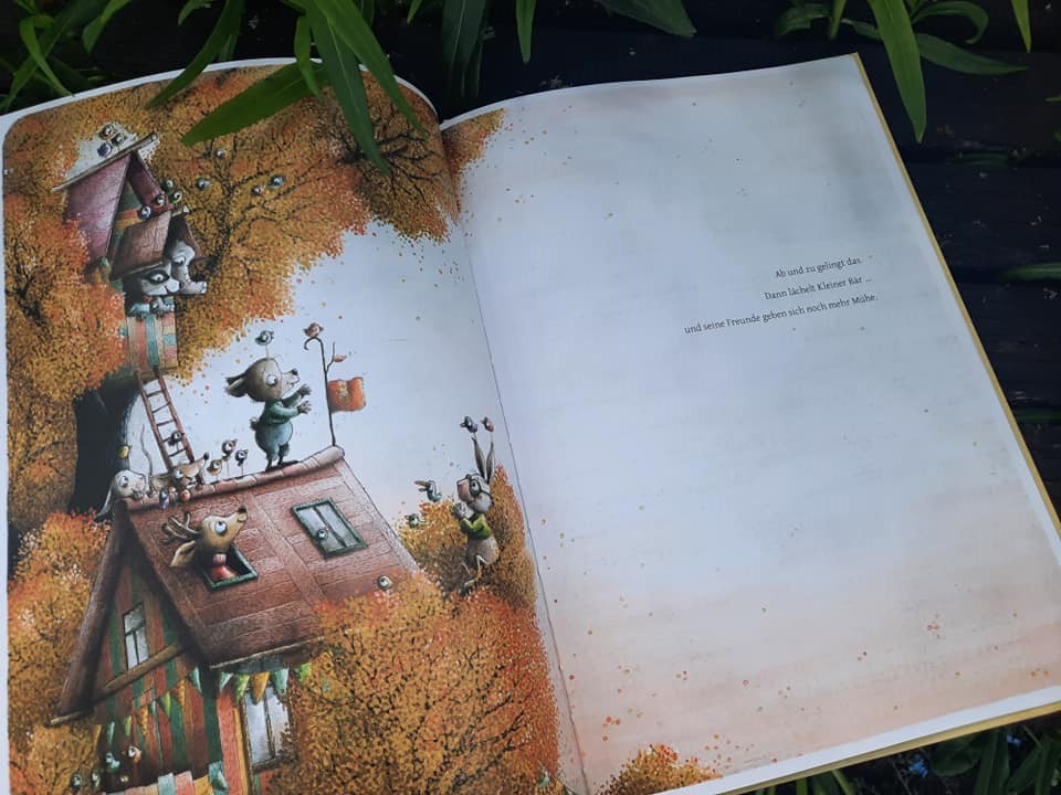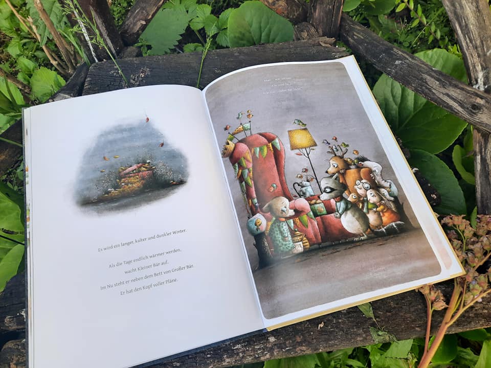 Auf den großformatigen Doppelseiten zeigt Frank Daenen das ein Bilderbuch auch mit wenig Text wunderbar poetisch sein kann. Die gedeckten und naturnahen Farben unterstreichen für mich perfekt die Worte und ergeben eine wunderbare Geschichte über Freundschaft und Erinnerung.