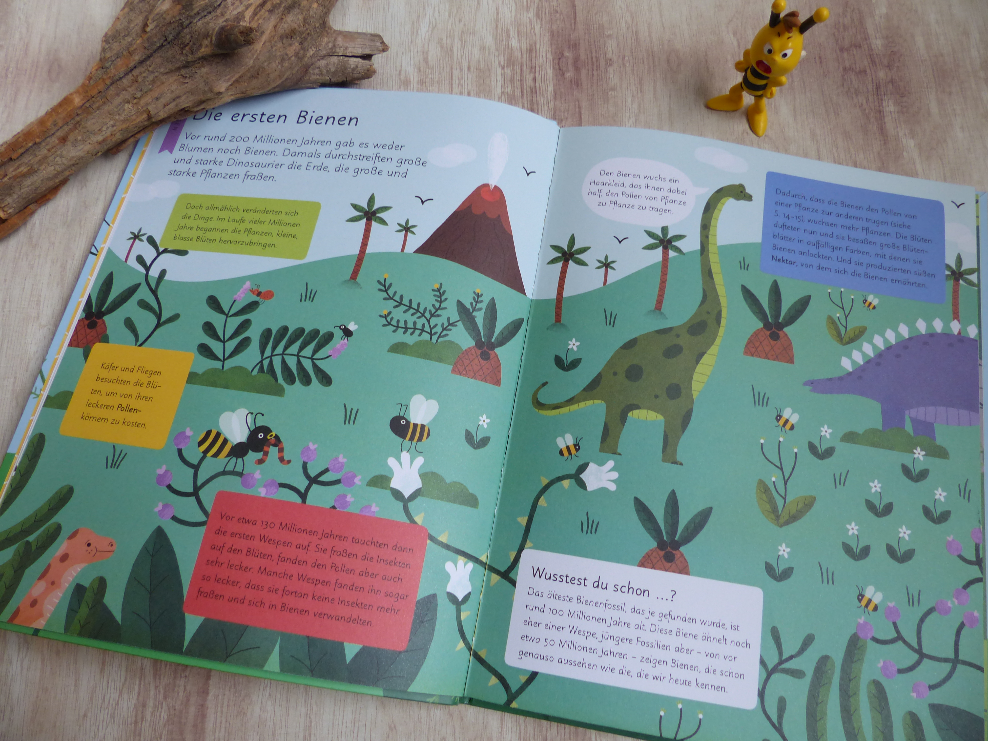 Das Buch ist wunderschön gestaltet. Neben vielen Infos zur Bienenvielfalt, den Sehfähigkeiten und der Nektarsuche (um nur einige wenige Beispiele zu nennen)gibt es immer wieder abwechslungsreiche Seiten rund um das Thema Biene. Es darf allerhand gebastelt und geforscht werden um das Universum der Bienen näher kennen und verstehen zu lernen . Besonders gelungen fanden wir z.B. den Bienentanz, der in diesem Buch mit einer kleinen Süßigkeitensuche verbunden wird. Aber auch die kleinen Experimente kamen bei uns gut an. So wird zum Beispiel anhand eines Experimentes kindgerecht und ganz einfach und anschaulich erklärt wieso Bienenwaben eckig sind.