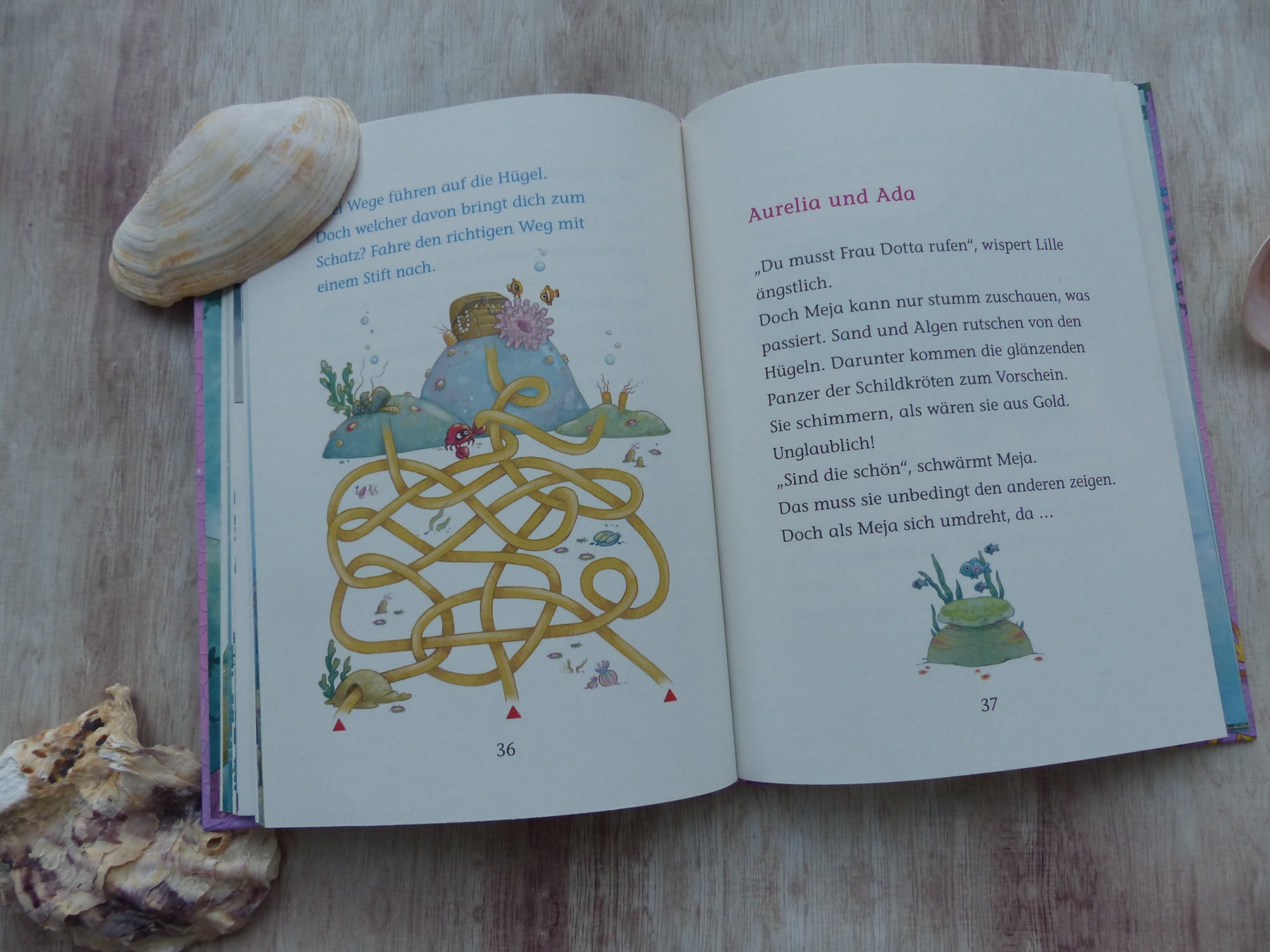 Die Satzstruktur ist einfach gehalten, und die Schrift ist des Anforderungen von Leseanfängern entsprechend . Der Hohe Bildanteil ist aber nicht nur ebenfalls bestens für Leseanfänger geeignet, sondern ermöglichte auch unserer Tochter die Geschichte altersgerecht zu verfolgen. Das Buch kann in mehreren Etappen gelesen werden, da die einzelnen Kapitel immer 3 bis 5 Seiten umfassen. Besonders gelungen fanden sowohl unsere Tochter als auch ich die kleinen Mitmach-Seiten, die es nach jedem Kapitel gab. Egal ob Labyrinth, Unterwasser-Witze oder das klassisches Fehlersuchbild. Auch ich fand es ganz angenehm, die Geschichte um die kleine Meerjungfrau nicht Non-Stop vorlesen zu müssen. Für Leseanfänger ist es ebenfalls wichtig, entsprechende Pausen zwischen dem Lesen vorzufinden.