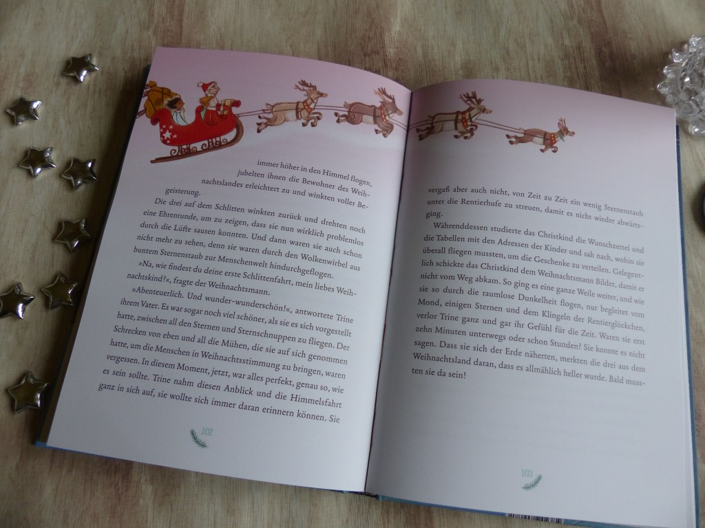 Ich habe das Buch mit meiner 5 Jährigen Tochter wirklich gerne gelesen, auch wenn es eigentlich erst für Kinder ab 6 empfohlen ist. Mann kann man es durchaus auch schon vorher lesen. Die einzelnen Kapitel sind nicht zu lang und zudem immer wieder auch farbenfroh und winterlich illustriert. Auf der Reise begegnen wir zauberhaften Gestalten und Figuren wie z.B. dem Schneemann, dem ersten der sieben Zwerge und neben dem Weihnachtsmann auch dem Christkind. Das fand ich besonders schön an dieser Geschichte, in der es eigentlich um den Weihnachtsmann und seine Familie geht: Auch das Christkind wird nicht nur erwähnt , sondern arbeitet Hand in Hand mit dem Weihnachtsmann. Eine schöne Lösung für beide Figuren. Denn früher oder später sehen sich alle Eltern mit der Frage konfrontiert, wieso bei manchen Kindern der Weihnachtsmann und bei anderen das Christkind kommt.