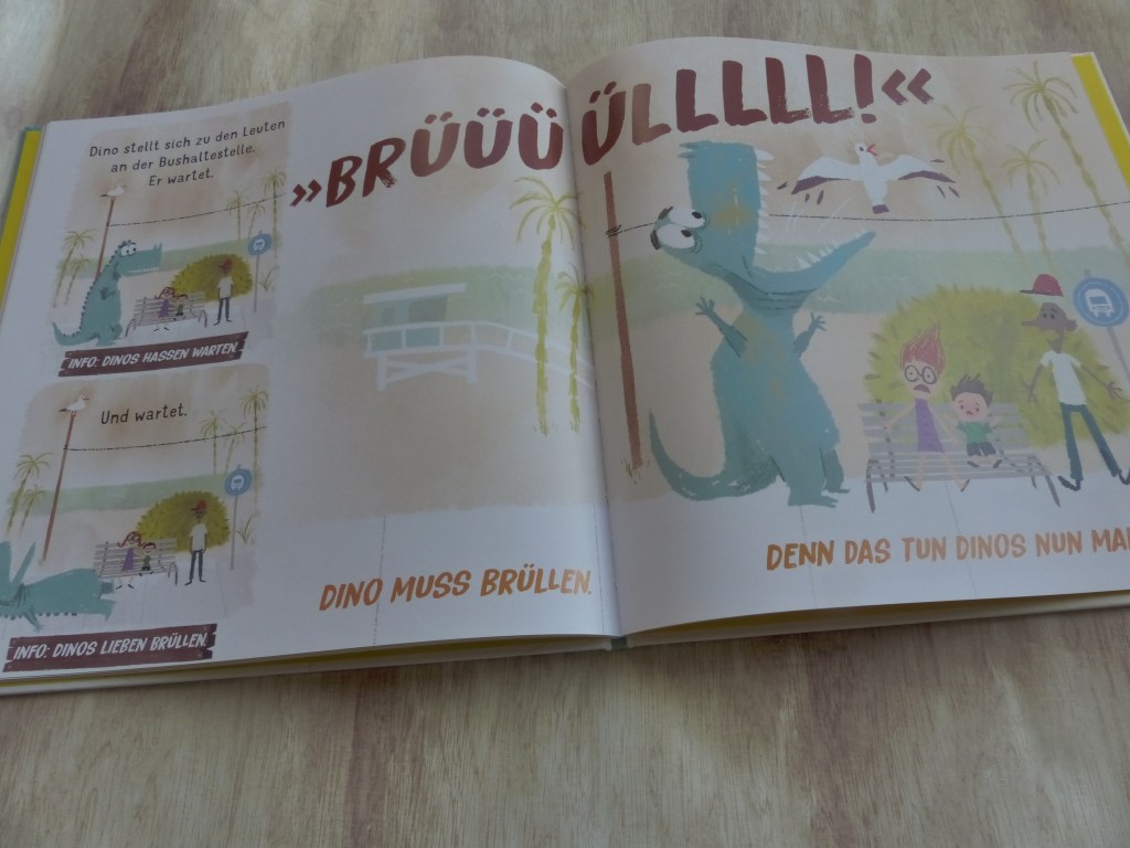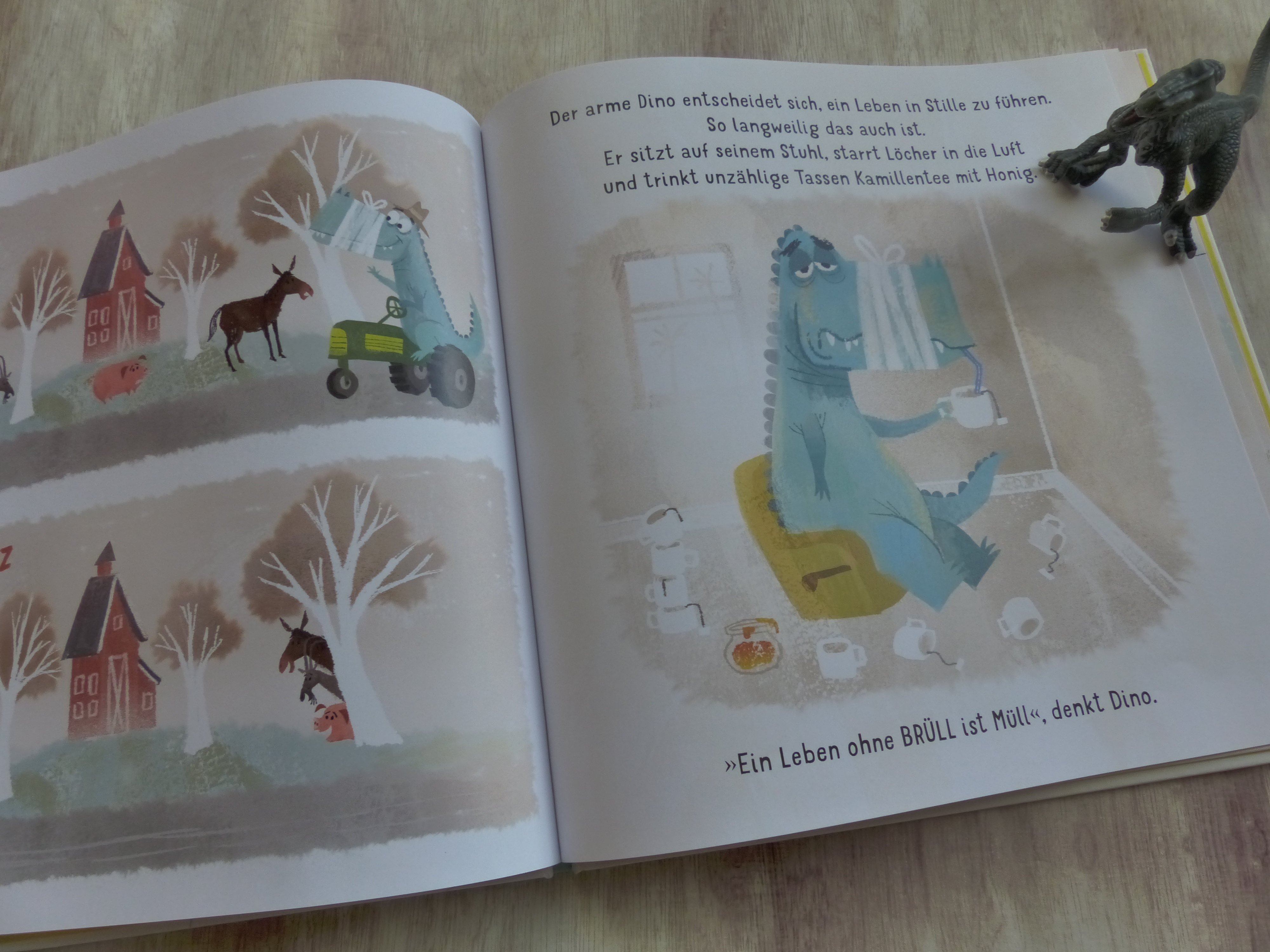 Die Story an sich ist ganz witzig. Dino liebt es zu brüllen, egal in welcher Situation oder bei welcher Gelegenheit , ein Dino muss einfach brüllen. Doch eines Tages ist er vom ganzen brüllen heiser und der Arzt verordnet ihm strikte „Brüllruhe“. Wirklich nicht einfach für einen Dino der sonst am liebsten immer und überall brüllt.