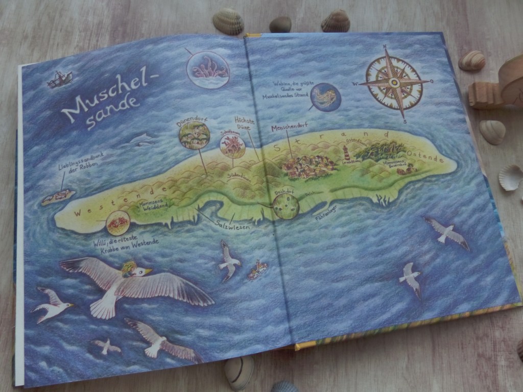 Bereits auf dem Vorsatz -Papier können wir die erste von den vielen meerestypischen und märchenhaft- anmutenden Illustrationen sehen : Eine Zeichnung der Insel Muschelsande, auf der Inna Inseling mit Ihren freunden Gerda , Theo und Mo lebt. Gerda , Theo und Inna gehören zu den Inselingen, den kleinen (für Menschen kaum sichtbaren) Einwohnern der Inseln, zu deren Aufgaben es gehört auf die Menschen der Insel aufzupassen und ihnen zu helfen wo sie nur können . Hier beginnt die Magie des Buches und der Geschichte. Und als sich zwischen dem Inseling Mädchen Inna und dem Menschenkind Mo eine bisher bis dato unbekannte Freundschaft anbahnt nimmt die Geschichte Ihren Lauf….