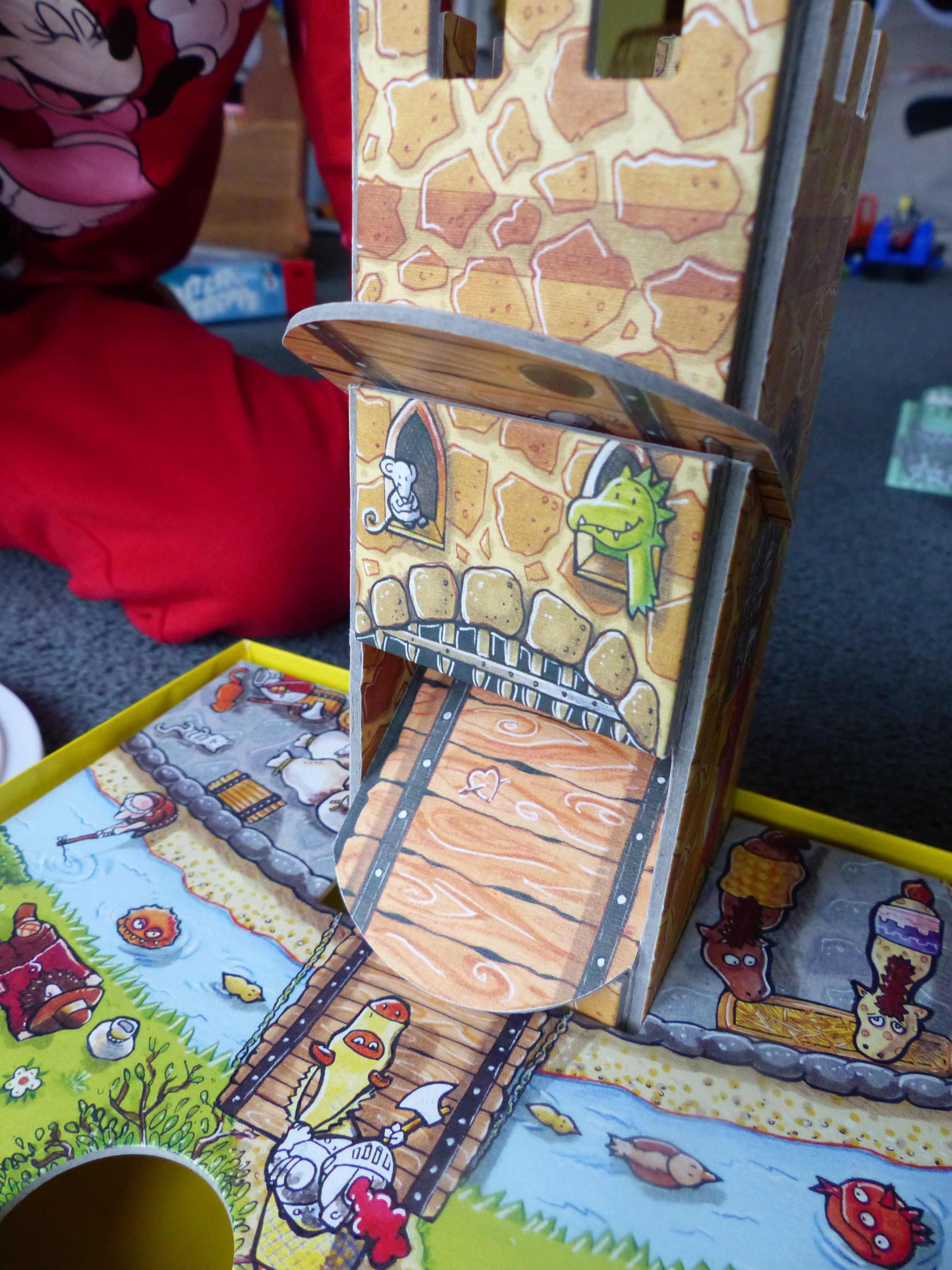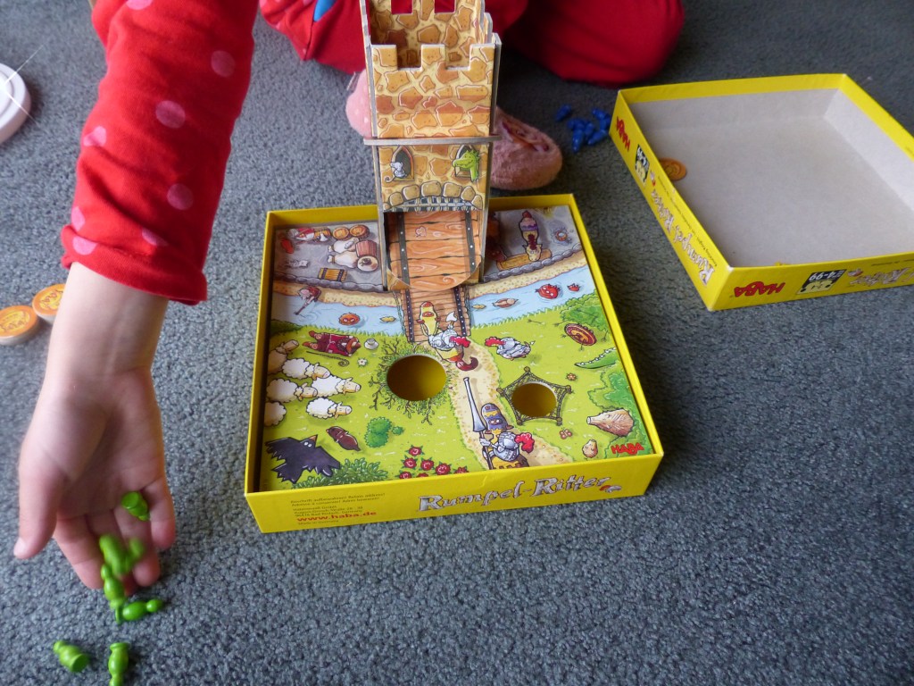 Das Spiel ist ein echter Glücksgriff gewesen und macht nicht nur den Kleinen Spaß. Besonders beliebt ist das betätigen der Falltür. Es gibt immer ordentliche Lacher wenn die ganzen Rumpelritter aus dem Turm purzeln. Hier gibt es auch einen kleinen Kniff. Ist der Turm nämlich beim rumpeln (ziehen der Falltür) leer und das Kind hat gut aufgepasst gibt es einen zusätzlichen Ritter zu gewinnen. Neben Spaß steht also auch ein klein wenig die Konzentration im Fokus. Auch wenn die Runden schnell gespielt sind und man schnell 2 Goldtaler gewonnen hat (die man Schlußendlich zum Gewinnen des Spieles benötigt)