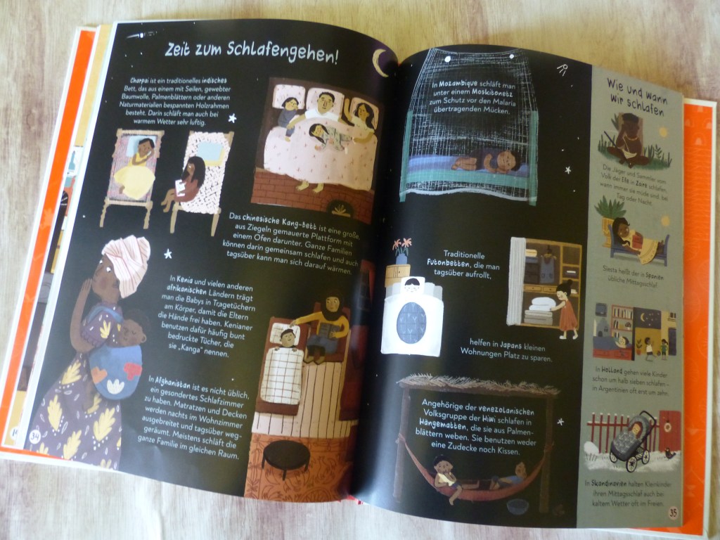„Ich zeige dir meine Welt“ ist für diese wissbegierigen Kindern genau das richtige Buch. Auf über 30 großformatigen Doppelseiten erfahren sie wie Kinder in anderen Ländern essen, welche Haustiere dort gehalten werden oder auch wie dort geschlafen wird. Sehr gut gefallen haben meiner Tochter auch immer wieder die Doppelseiten zum Thema „So viele Sprachen“ , eine Übersicht darüber wie man in den verschiedenen Ländern „Hallo“, „gute Nacht“ oder auch „Bitte“ und „Danke“ sagt. Das Buch bietet eine enorme Vielfalt an Wissen und darüber hinaus gibt es auf den Illustrationen so viel zu entdecken und bestaunen, dass wir wirklich viele Abende lang Freude an dem Buch hatten.