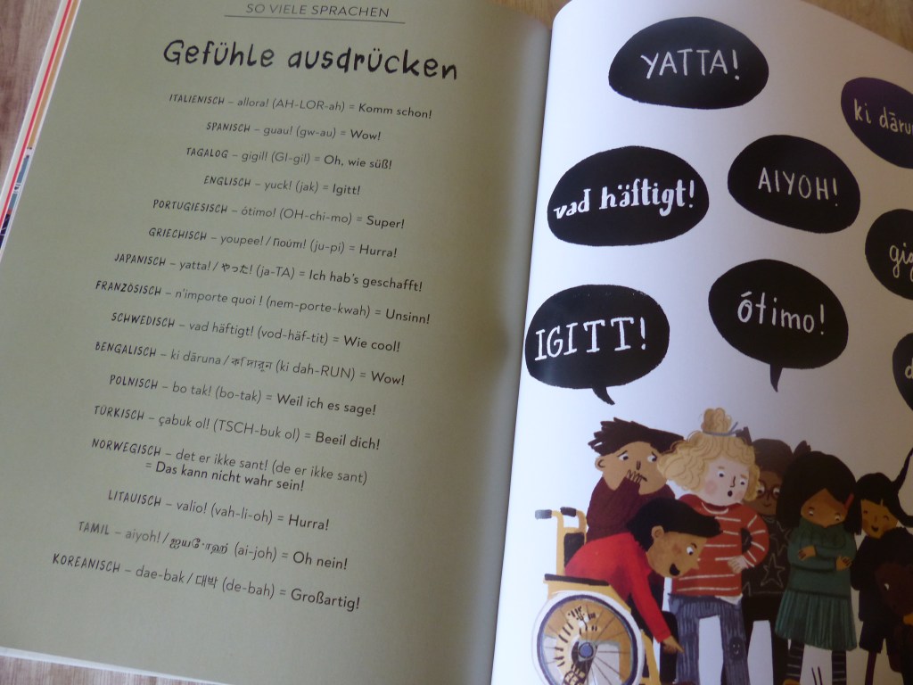 Neben den gängigen Sprachen wie Englisch, Französisch, Spanisch und Co. Fand ich wunderbar , dass auch weniger bekannte Sprachen wie Swahili, Mandarin oder Kmher thematisiert werden. Nicht nur meine Tochter hat eine Menge Neues erfahren, auch für mich ist dieses Sachbilderbuch ein kleiner Quell an neuem Wissen gewesen. Ich liebe es mit meiner Tochter gemeinsam neue Dinge zu entdecken, und dafür bietet dieses Buch genau die richtige Gelegenheit.