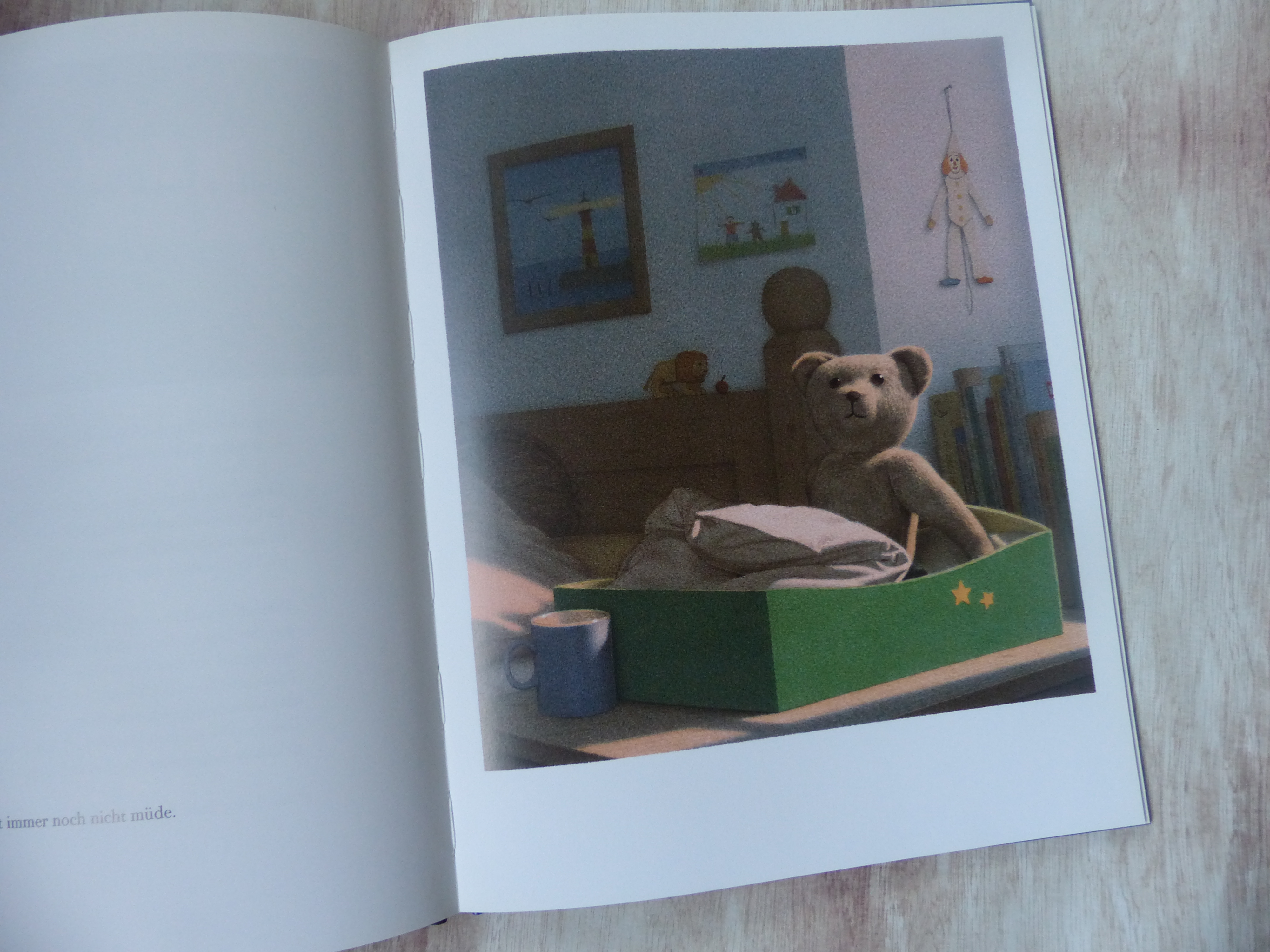 Ganz realitätsgetreu wird auf der ersten Seite das Szenario beschrieben, was alle Eltern kennen, bevor das eigene Kind endlich in den Schlaf findet: Der Bär hat eine Gute-Nacht-Geschichte gehört, ein Schlaflied mitgesummt, noch mal ein Schluck Wasser getrunken, er wuselt hier und er wuselt da. Kurzum eigentlich will er eigentlich noch nicht schlafen gehen. Und so kommt es, dass der Bär am Fenster steht und den Mond beobachtet. Der Mond hoch oben am Firmament, der all das mit seinem Licht bescheint, was der Bär von seinen Tages-Abenteuern kennt. Im Mondlicht sieht alles ganz anders aus. Es wirkt anders. Viel sanfter und leiser. Die Gegensätze von Tag und Nacht werden hier auf eine ganz einfühlsame Art und Weise thematisiert und helfen so nicht nur dem Bären ins Bett zu finden, sondern auch den kleinen Zuhörern vor dem Buch. Der kleine Bär denkt an all die Abenteuer die am nächsten Tag auf ihn warten. Er macht Pläne, überlegt was er mit dem neuen Tag anfängt und ich muss schmunzeln, denn unzählige Abende habe ich mit meiner Tochter im Bett gelegen und darüber geredet wie der Tag gewesen ist und was wohl am nächsten Tag ansteht. Der Bär kommt zur Ruhe, lauscht den Geräuschen der Nacht und schläft schließlich ein.