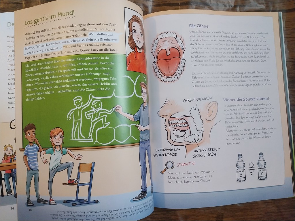 Wer bei diesem Buch mit einem reinen Sachbuch für Kinder ab 7 rechnet wird überrascht sein. Ich zumindest bin es gewesen, als ich die erste Seite aufschlug. Jede der Doppelseiten besteht nicht nur aus einem gut illustrierten, informativen Teil, sondern auch aus einer Geschichte rund um Lucy und Ihre Familie. Hier konnte das Buch bereits das erste Mal bei mir und meiner 6-Jährigen Tochter punkten, denn wir beide waren gleichwohl auf ein reines Sachbuch eingestellt. Umso größer ist die Freude über die erzählende Handlung gewesen. Meiner Tochter gefielen vor allem die kleinen Quizrunden am Ende einer jeden Doppelseite. Sie fieberte richtig daraufhin . Ich für meinen Teil konnte auch noch eine ganze Menge Neues lernen und bin erstaunt gewesen, was unser Körper und seine Zellen alles leisten. Das Wunderwerk Verdauung wurde hier auf eine wirklich tolle, kindgerechte Art und Weise aufbereitet. Ich finde dieses Buch nicht nur wunderbar für Zuhause geeignet. Auch für den Schulunterricht bietet es ganz tolle Ansatz- und Einsatzmöglichkeiten. Ich fand das Buch so gelungen, dass ich aus derselben Reihe bereits “Einfach aufgeklärt” , ein Buch zum Thema Aufklärung, bestellt habe.